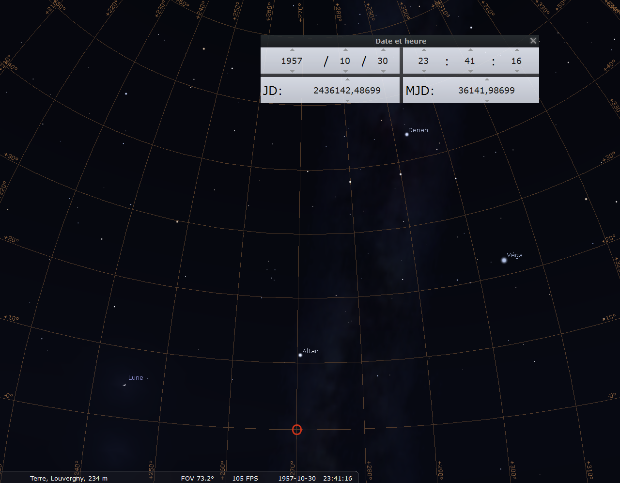 Le premier groupe observe depuis Louvergny à 23h40 en direction de l'Ouest un disque rouge de grand diamètre stationnaire et qui semble se séparer en deux parties à 23h50 avant de disparaitre. La vérification astronomique donne la Lune à l'azimut 245°et une élévation à 30° apparaissant comme un demi-disque incliné. Les descriptions données correspondent mal avec la Lune (élévation et forme).