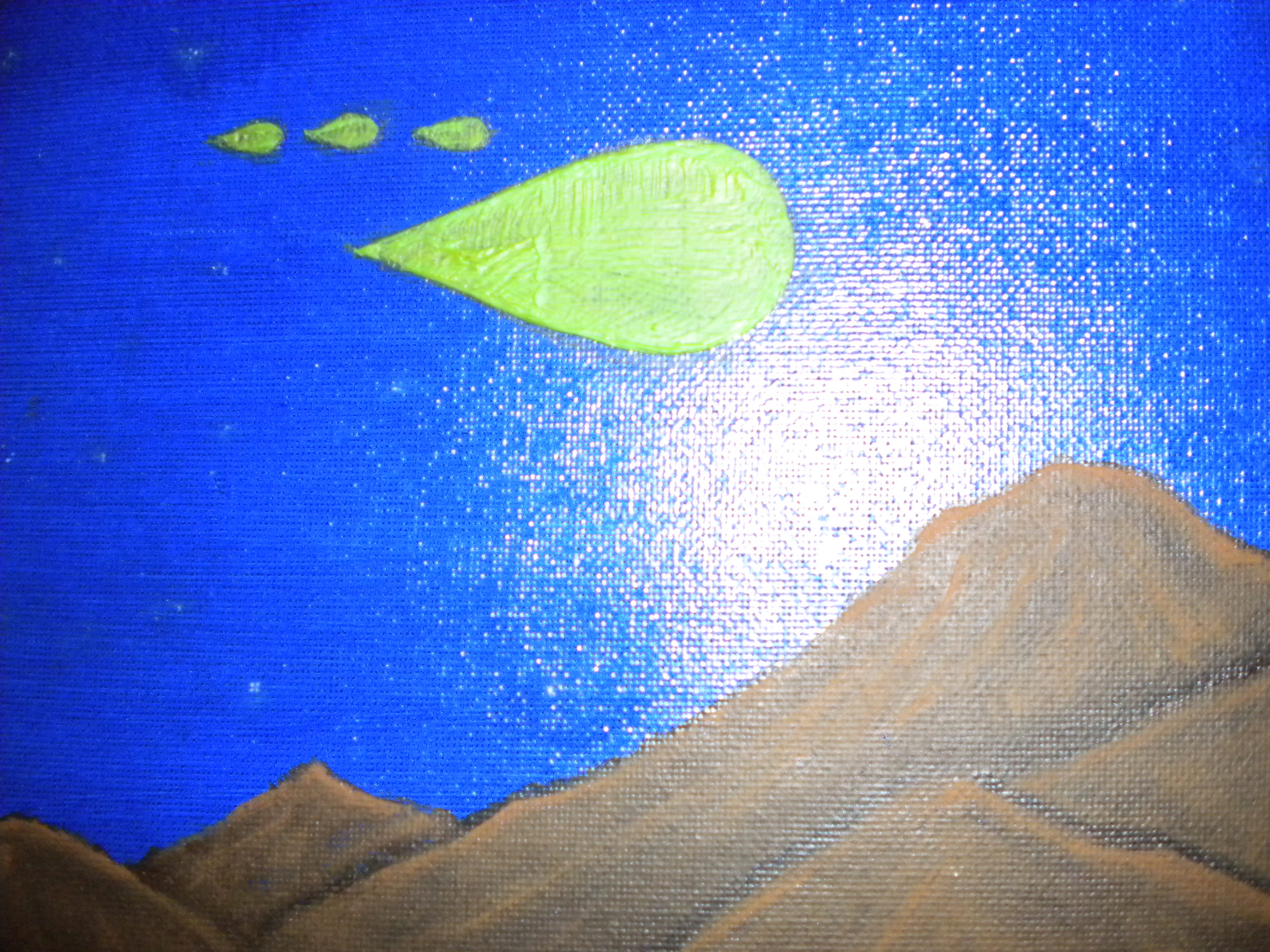 Observation du passage silencieux et rapide d'une lueur verte et d'un phénomène en forme de gouttes : forte probablilité d'observation d'une rentrée atmosphérique mais manque de précision (date).