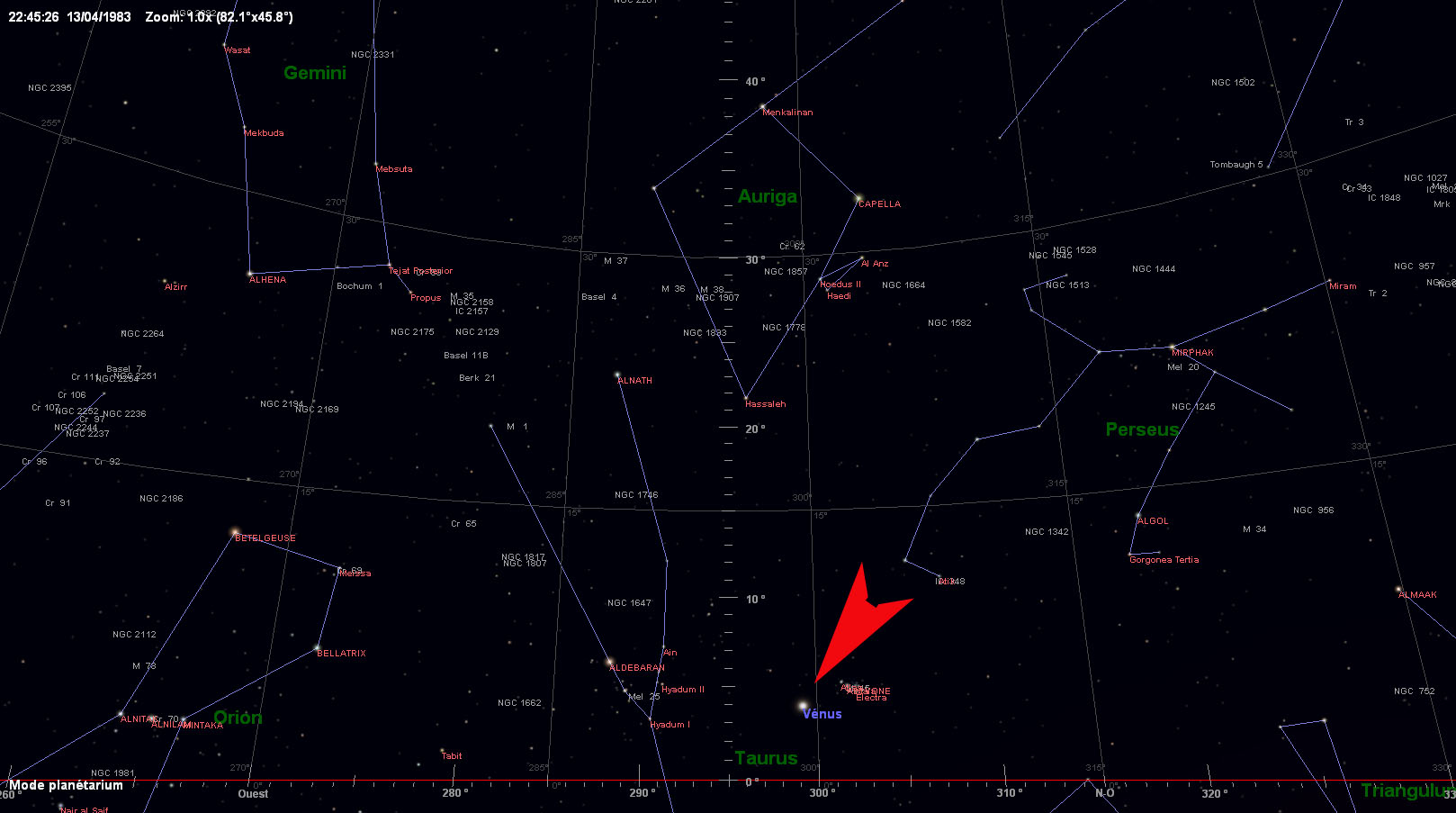 le 13 avril 1983 entre 22h 45 et 23h 05 deux automobilistes vont apercevoir dans le ciel à très haute altitude une boule très lumineuse. Celle-ci de la grosseur d'une balle de hand-ball est de couleur jaune-verdâtre avec une luminosité variable. Observée aux jumelles, cette boule semble avoir des déplacements verticaux rapides mais ne s'éloigne jamais de plus de 40 à 50 cm de l'emplacement initial où elle revient toujours. La luminosité devenant insoutenable, les témoins ont arrêté leur observation. L'examen de la carte du ciel le jour de l'observation permet d'identifier Vénus assez bas sur l'horizon ( moins de 5 °) dans la direction 300° qui correspond à l'angle de l'observation. Les témoins ont donc probablement été impressionnés par une luminosité importante de la planète Vénus.