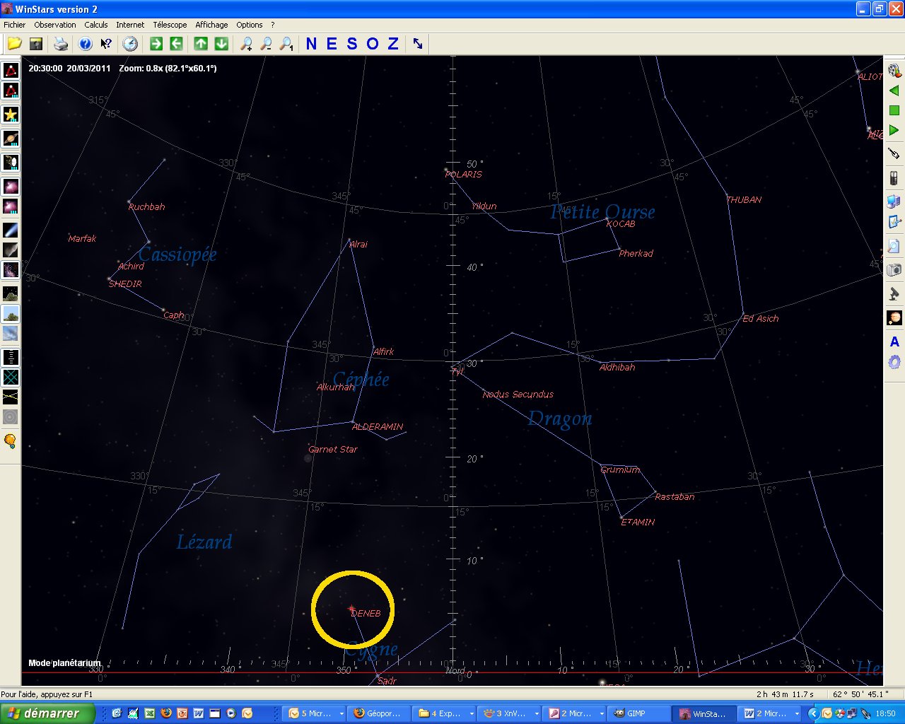 La direction indiquée par le témoin, à gauche de sa direction de route E/NE, donne le N/NE. A cet endroit du ciel, brillait l'étoile Deneb, une des plus brillantes étoiles du ciel (une des 3 du triangle d'été).