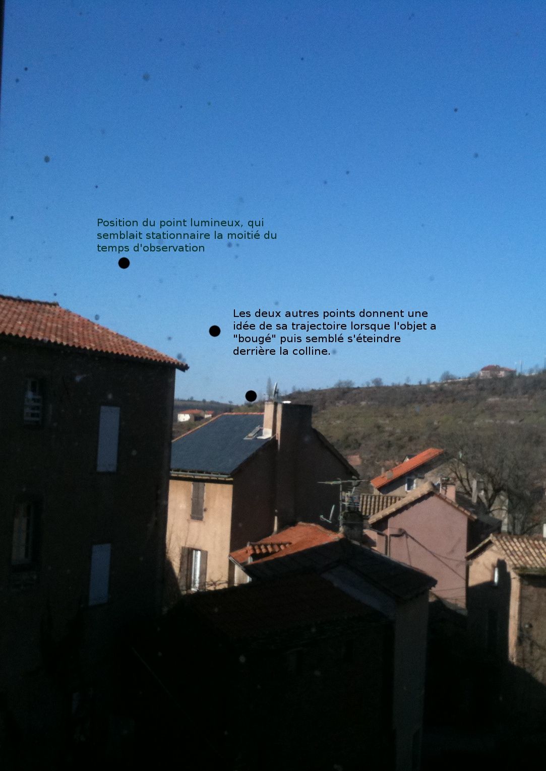 Deux témoins rapportent leurs longues observations d'un phénomène très lumineux dans le ciel. Les 20 et 21 février 2012 aux environs de 20h 20 un témoin dans l'Aveyron observe en direction de l'Ouest le lent déplacement d'un point particulièrement lumineux. Le témoin utilisera un appareil photo et une caméra pour voir et filmer le phénomène.