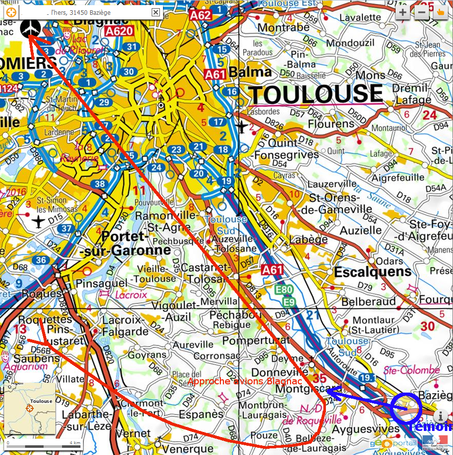 C'est en-dessus de Montgiscard que les avions s'apprêtant à atterrir à Blagnac s'alignent dans l'axe Nord Ouest de la piste de Blagnac : un avion de face, avant son virage vers le NO, aurait pu se présenter comme un ensemble de points lumineux, uniquement visibles avant le virage vers le NO (voir carto).