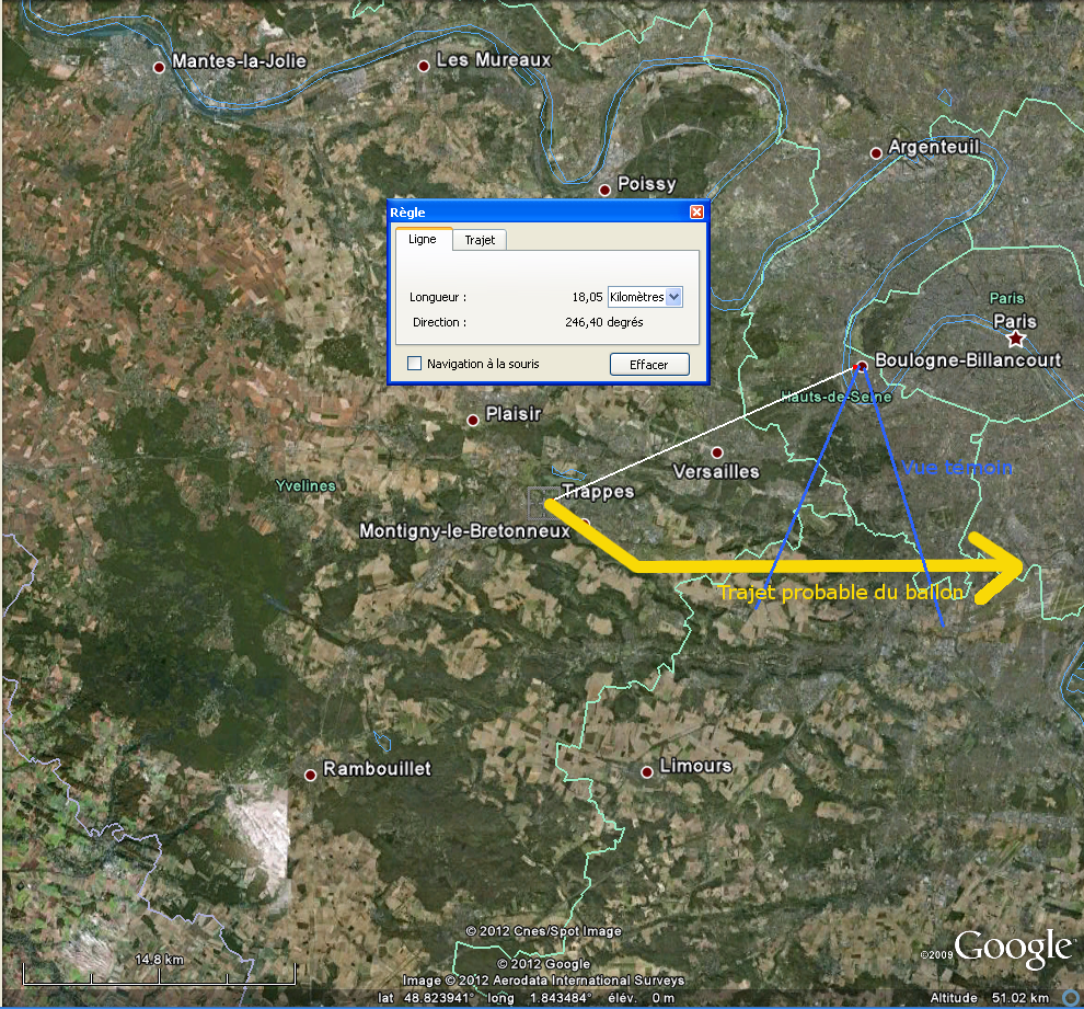 Par contre Météo-France fait des lâchers de ballons sondes quotidiens depuis Trappes vers 12h TU, soit à 14h locales, c'est-à-dire une heure avant l'observation (voir le relevé qui indique que le vent au sol est du NW assez faible (5 kt) à 14h,qu'il passe ensuite à W plus fort (25 kt) à partir de 2800 M, pour repasser au NW plus haut). Comme les vents en altitude soufflaient vers l'Est, ce ballon expliquerait bien l'observation, environ une heure après le lâcher. Les clignotements correspondent à la rotation du ballon ou de réflecteurs.