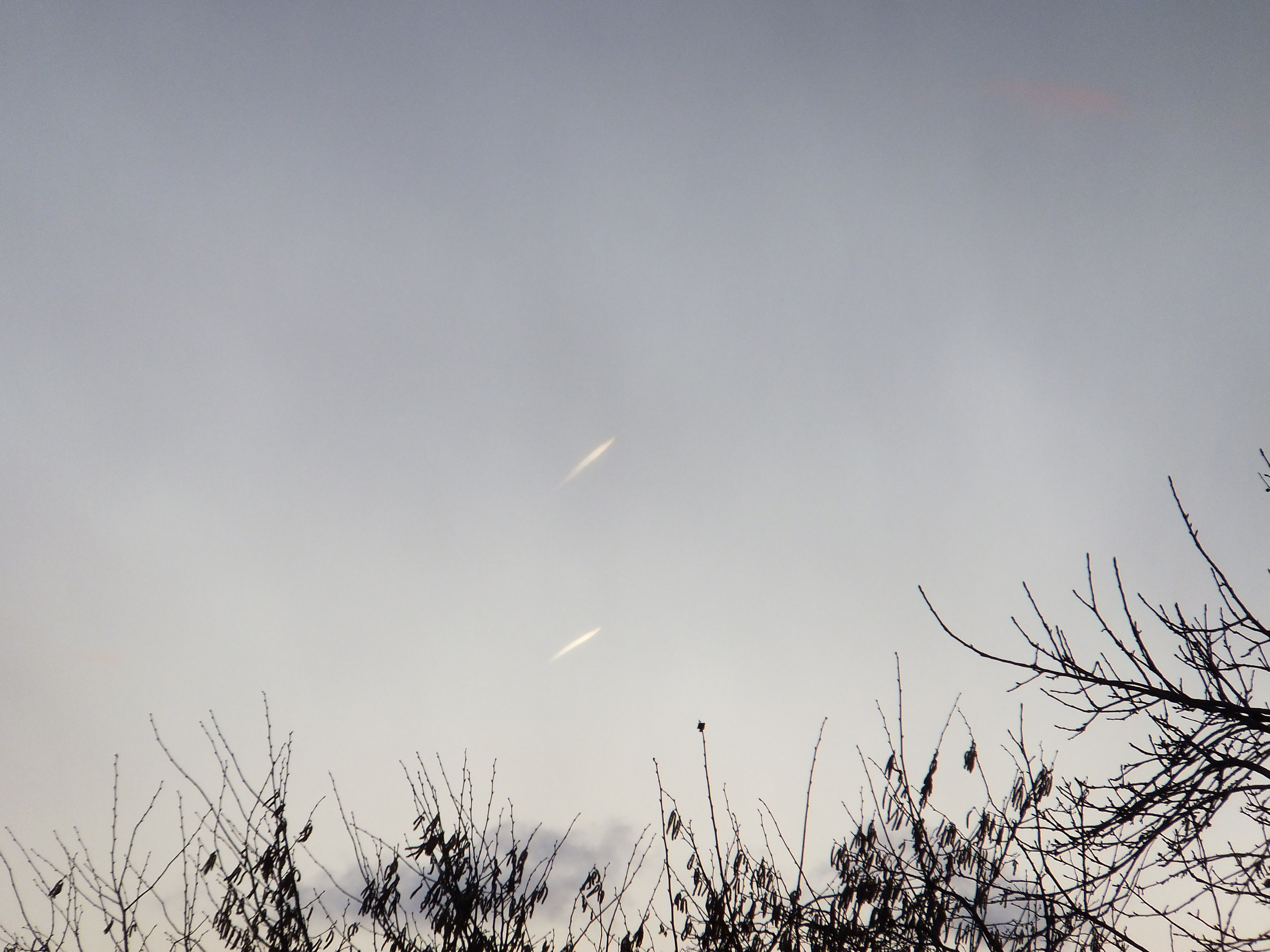 La photographie de ce phénomène, (prise au 1/125s, très nette), évoque nettement des traînées de condensation d'avion. A cause du vent du Nord, sec (65% humidité, source Météociel) ces traînées sont courtes ; du fait des conditions d'observation (coucher du soleil à 18h01 au Mans) elles sont encore en plein soleil, alors que le bleu du ciel commence à s'assombrir : le contraste est alors très fort, les traînées ressemblent à des flammes. Lorsque l'ombre de la Terre atteint ces traînées, elles ne sont plus illuminées, et ne sont alors plus visibles car elles sont bien moins lumineuses que le bleu du ciel.