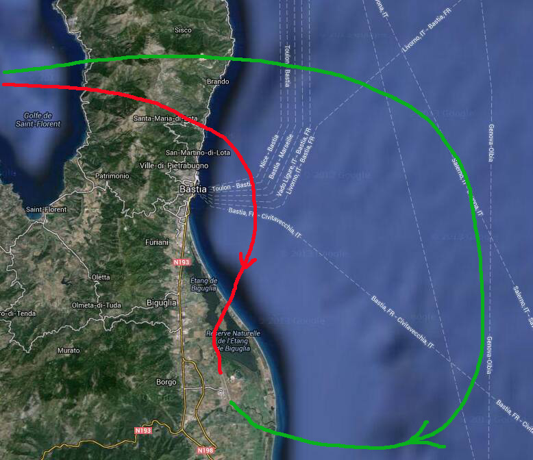 L'heure qu'il mentionne, 21h45, coincide avec l'arrivée du vol air CORSICA MARSEILLE-BASTIA qui part à 21h05 de MARSEILLE et atterrit en principe à BASTIA à 21h55; cela peut correspondre avec ce qu'il a vu. L'aéroport de BASTIA PORETTA se situe à 3 ou 4 kms à vol d'oiseau du lieu d'observation, au Nord-ouest. Voir en annexe les trajectoires d'approche de l'aérodrome de Bastia : en rouge la voie utilisée par vent de sud ouest, comme ce jour là (voir rapport météo).