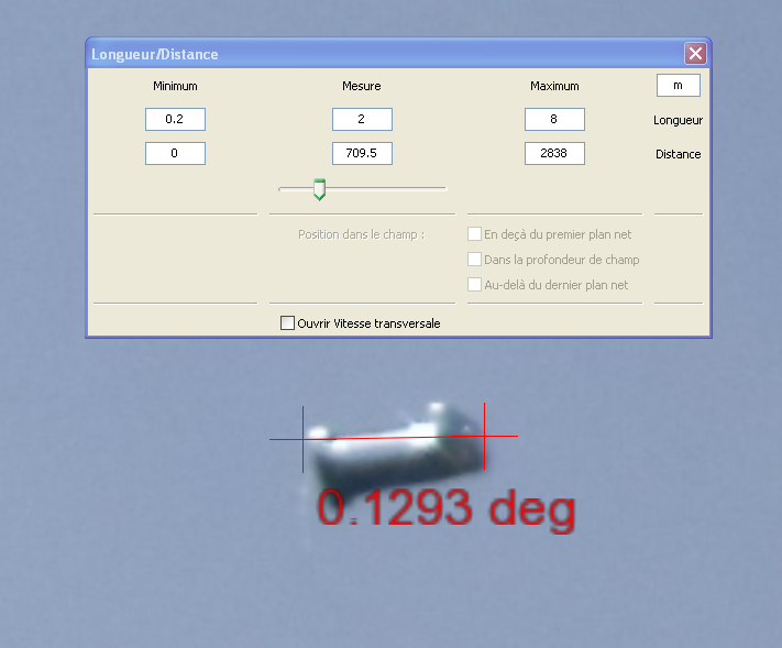 Cette direction de déplacement est compatible avec le vent de Sud qui souffle à environ 18 km/h. Si c'est un objet porté par le vent, il aura parcouru un peu plus d'1 km. Si l'on prend l'hypothèse d'un ballon de 2 mètres (ex : ballon solaire artisanal Vol de ballons solaires), l'analyse géométrique de la photo le positionne à environ 700m (cf schema). Il peut aussi faire 4m et être à 1,4 km. L'origine de ce ballon n'a pas pu être déterminée par le GEIPAN : pas de fêtes notables dans l'environnement Sud du témoin. Il peut s'agir d'un objet expérimental fait par un amateur, ou d'un objet festif (on peut imaginer la forme d'un "1").