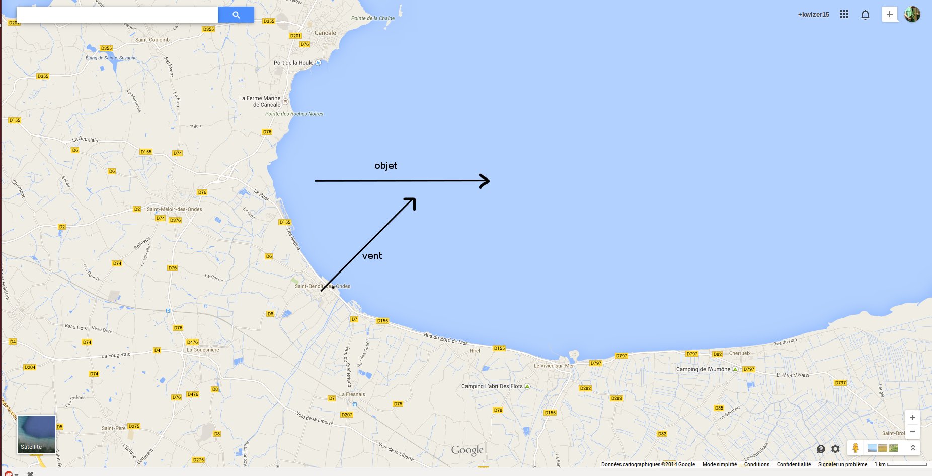 Le témoin, du fait de son activité, est plus ou moins dos au vent, regardant vers l'Est ou le Nord-Est (vent d'Ouest à Nord Ouest). Le témoin a vu passer l'objet au-dessus du cerf-volant, et disparaître vers le Nord (selon le questionnaire) ou l'Est (selon le schéma du témoin nommé : stbenoit.jpg).