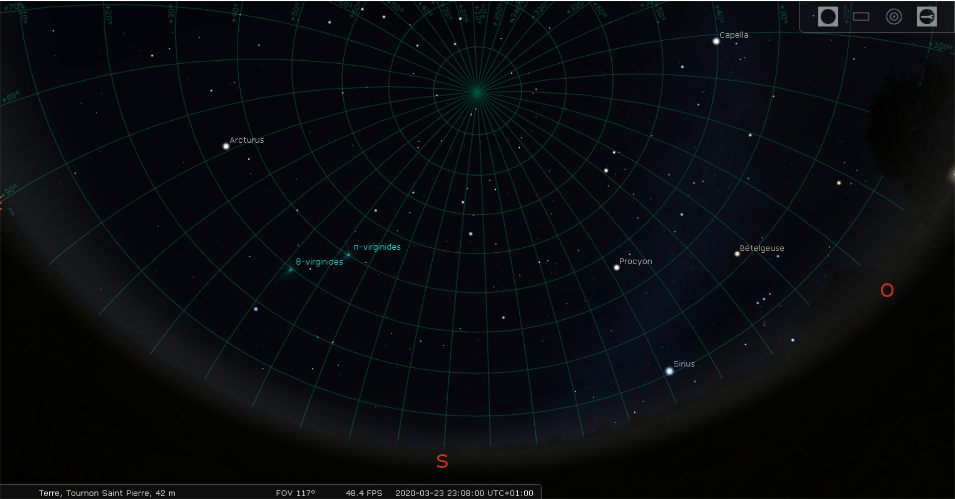 Grâce à une photo streetview transmise par le témoin situant la position du PAN et l'utilisation de GoogleEarth, nous pouvons déduire que celui-ci se trouvait à peu près à l'azimut 240°, pour une élévation d'environ 30° à 23h08 (heure locale) le 23/03/2020. Une analyse via l'application Stellarium démontre la présence, à cet horaire, de l'étoile Procyon à quelques degrés près de ces azimut et élévation. Procyon a la luminosité apparente de 0,37, appartient aux étoiles les plus brillantes du ciel. La couleur et la luminosité décrites par le témoin restent cohérentes avec l'observation de Procyon.